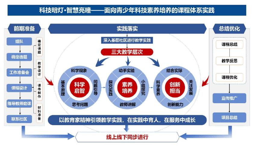 实施“从基础到实践”的教学路径:通过基础科学知识讲解、科学实验演示与操作,逐步过渡到创新应用类项目,三大教学层次推进。