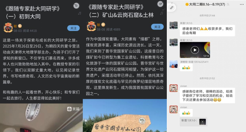 3.形式多元,强化协同与实效。本次研学实践活动突破了传统单一考察模式,构建了“高校主导、校校联动、校企支撑、服务地方”的立体化实践范式。学部不仅派出骨干教师团队,还邀请天津中学教师阎为国参与部分课程讲授与实地指导,有效促成了大学与中学地理教育在教学内容、方法与实践层面的深度融合与衔接;联合天津市地理学会、天津市生态学会、天津市天文学会等多家专业机构,获取了跨学科、高水平的学术支持与专家资源,显著提升了研学的科学内涵与专业保障水平,通过引入规范化管理模式,在课程落地、后勤保障、风险管控等方面实现了高效、安全的专业化协同。