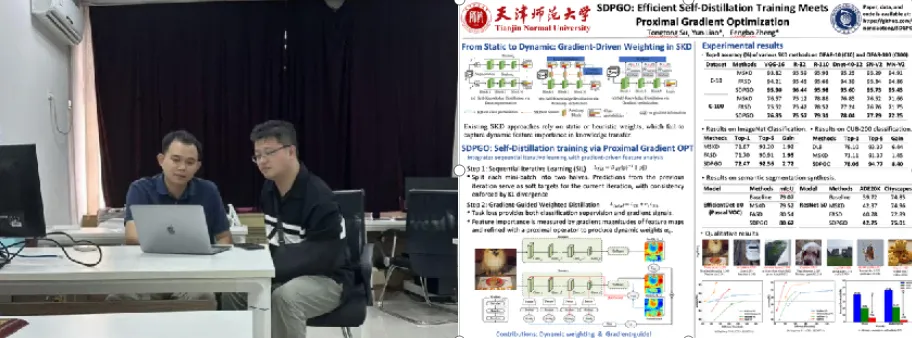 暑期,郑逢勃与学院青年教师宿通通合作论文《SDPGO: Efficient Self-Distillation Training Meets Proximal Gradient Optimization》成功被人工智能顶级国际会议NeurIPS 2025接收,NeurIPS(Annual Conference on Neural Information Processing Systems)是人工智能领域的CCF-A类会议,也是全球最具影响力的学术盛会之一。论文围绕深度学习中的知识蒸馏问题展开研究,提出了一种基于梯度优化的自蒸馏训练框架(SDPGO)。该方法通过引入梯度信息,动态识别并强化关键特征,使模型在自蒸馏过程中能够更加高效地学习对分类性能影响显著的表示。实验结果表明,SDPGO在多个数据集上显著优于现有方法,在模型压缩与性能提升方面展现出良好的普适性与先进性。