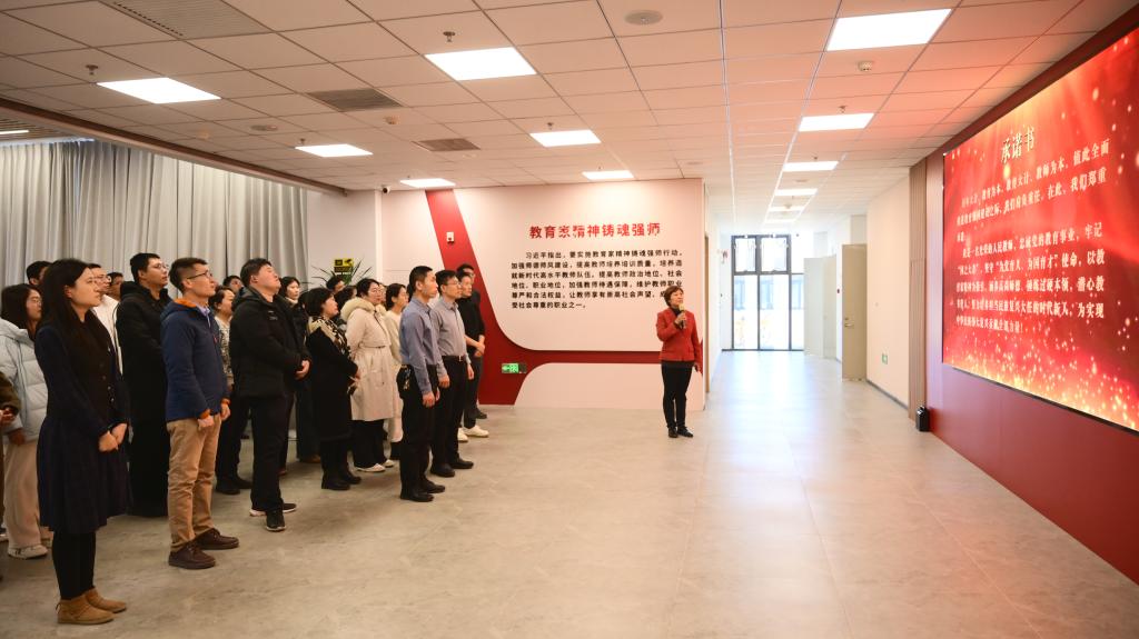 60余位青年教师再次齐聚,奔赴“新质生产力”第一站脑机交互与人机共融海河实验室实践交流,领略前沿研究服务国家重大战略需求的强劲动能,真切体会产教研深度融合的创新范式与实践价值,纷纷对科研创新如何对接产业需求、赋能社会发展产生了新的思考。随后,青年教师一行前往天津师范大学,开启“文化铸魂”第二站,在校园博物馆内沉浸式感受文化传承发展的深厚底蕴、体悟校园文化育人高地的独特魅力后,大家共同走进今年9月新揭牌的天津市教育家精神培育弘扬研究实践中心,重温习近平总书记对教师队伍建设的殷切期望,系统学习教育家精神的核心要义与时代价值,在一代代教育家的精神传承谱系里,感悟薪火相传的师道文化,汲取人民教育家、最美教师等先进典型的榜样力量,并共同许下庄重承诺,完成了一次深刻的师德淬炼与精神洗礼。